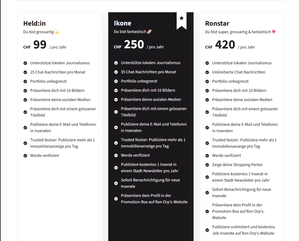 Das Basisabo bei Ron Orp ist kostenlos. Willst du von weiteren Features profitieren, für dein Business werben, Produkte über Ron Orp verkaufen etc., empfehle ich dir ein Abo Upgrade. Mehr dazu hier: Abo-Optionen.