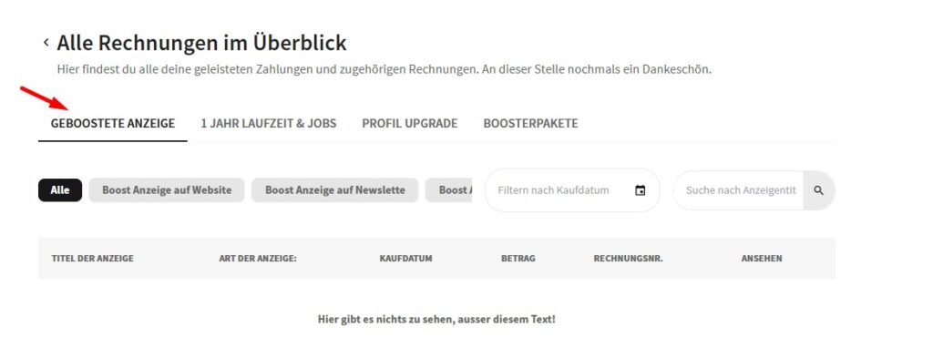 Dazu gehst du in deinem Dashboard zu «Alle Rechnungen» und wählst dort «Geboostete Anzeige» aus. Jetzt hast du noch die Möglichkeit zu filtern, welchen Boost du für das Inserat gewählt hast.