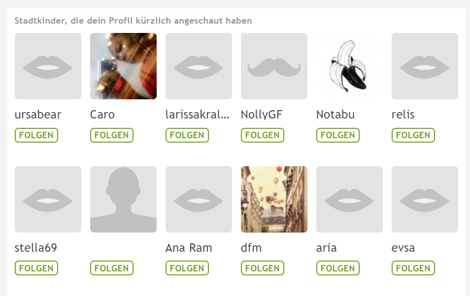 Um zu sehen, wer dein Profil angeschaut hat, wähle «Mein Profil» an und scrolle ganz nach unten. Dort findest du die Stadtkinder, die dein Profil angeschaut haben. Achtung: Für dieses Feature brauchst du ein Urban Pro Abo (Abo-Optionen).